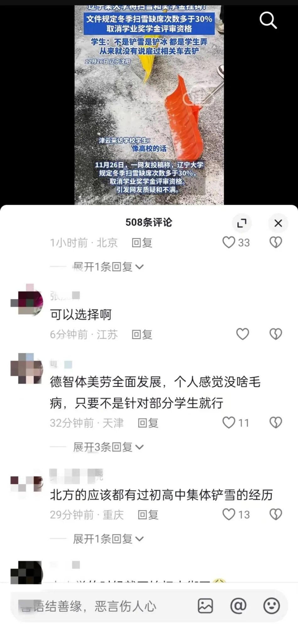 近日,有网友发布“辽宁大学化学院研究生学业奖学金评审细则”,细则中规定:冬季扫雪缺席次数多于30%的该学院研究生,将取消学业奖学金评审资格,引起广泛关注。 据网友提供的《细则》显示,研究生有以下情况之一,取消其学业奖学金评审资格:1.冬季扫雪缺席次数多于30%。联培学生请提供完备的联培协议在学院备案后,可以不参加扫雪;2.在学校和学院的寝室卫生检查中不合格;3.在寝室使用违章电器被查。 ![]() 发布该细则的网友小周(化姓)表示,自己是辽宁大学化学院研究生二年级的一名学生,,他认为学校把扫雪与奖学金挂钩,相当于变相把压力给到了学生。小周还称,对于这份《细则》有意见的学生不止他一人,其身边有多个同学都表达了对这一规定的不满。 11月26日,辽宁大学化学院有学生透露,此细则于三天内发布,学校不雇铲雪师傅,其担忧会出现安全问题,“这个路面这么滑,万一铲雪滑倒受伤怎么办?扫可以扫,但是学校丝毫没有雇人、雇铲雪车来帮着清理的意思,全让学生去整,完全就是拿学生当苦力!” ![]() 26日下午,针对“扫雪和奖学金挂钩”一事,辽宁大学化学院一工作人员回应称,学院出台此《细则》,旨在鼓励学生们积极参与扫雪,这不仅是锻炼劳动能力的机会,也是参评奖学金的基础。“没有完成一名研究生应该具备的劳动教育,这是不应该的,最基本的(劳动)能力都没有的话,怎么去评奖学金?” 此外,该学院一位老师透露,出台《细则》也是无奈之举:“以往时候,我们不跟奖学金挂钩,谁老实,谁听话就去扫雪,有些同学觉得我可以不去干,就不去。”因此,为了调动大家扫雪的积极性,学院才在今年制定《细则》。 ![]() 据了解,上述《细则》的制定依据源于《辽宁大学研究生学业奖学金管理办法》(简称《办法》),该《办法》第六条规定,研究生违反国家法律法规和学校规章制度的,将被取消奖学金评审资格,在《细则》末尾,则载明本评审细则的解释权归学院党政联席会议。 作为地处东北地区的高校,辽宁大学其他学院对扫雪是否有类似规定? 辽宁大学党政办公室一工作人员表示对扫雪相关规定并不清楚,并称具体规则需咨询各学院。辽宁大学新华国际商学院一名大四学生表示,她在大学期间并未听说扫雪能够直接影响奖学金的评定。辽宁大学法学院研究生办公室一名工作人员在听到化学院的相关细则后,否认本学院有上述细则规定,“应该没有这个要求”。 ![]() 网友们也纷纷表达了自己的观点,大部分IP地址为北方的网友都提到在学校扫雪,是自己宝贵的回忆。有网友称:“德智体美劳全面发展,个人感觉没啥毛病,只要不是针对部分学生就行。”也有网友发布评论称:“倒是挺合理,反正不需要奖学金的也没什么损失。而且大学生出力长力,也当锻炼身体了,比(在)宿舍玩手机强。” END 来源:央广网 编辑:王宇豪 排版:王宇豪 审核:溪溪