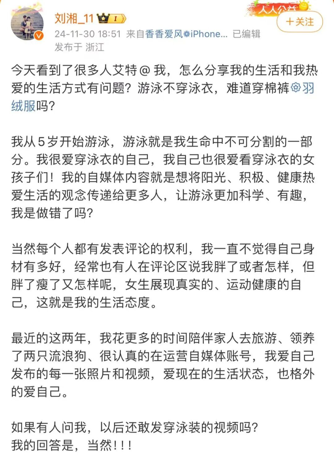 11月30日,刘湘在微博上也对此事进行了回应,“我很爱穿泳衣的自己,我自己也很爱看穿泳衣的女孩子们!我的自媒体内容就是想将阳光、积极、健康热爱生活的观念传递给更多人,让游泳更加科学、有趣,我是做错了吗?”