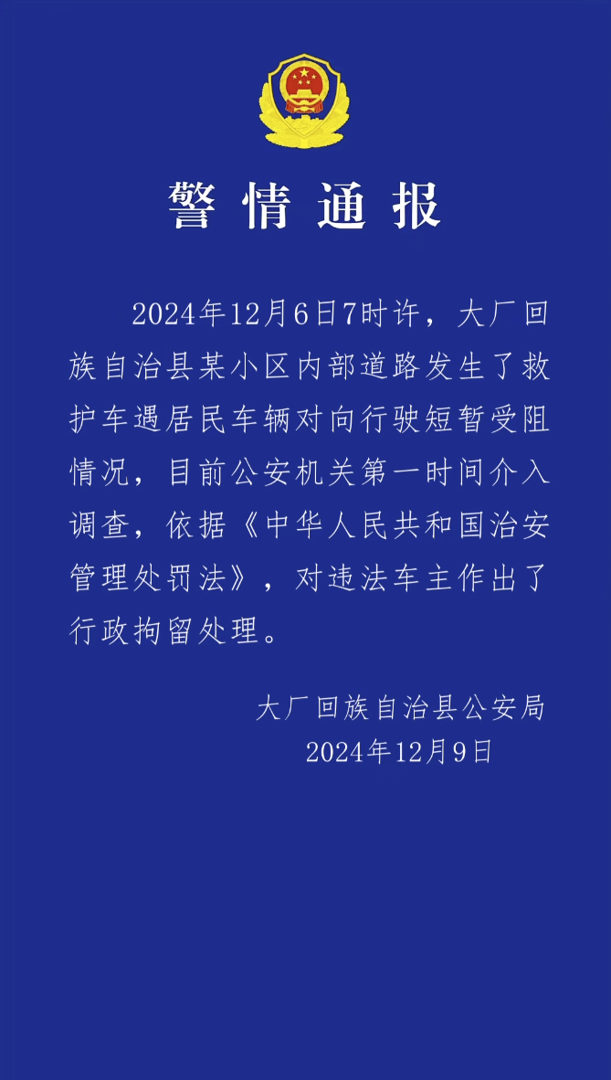 12月9日,河北大厂回族自治县公安局发布警情通报:12月6日7时许,大厂回族自治县某小区内部道路发生了救护车遇居民车辆对向行驶短暂受阻情况,目前公安机关第一时间介入调查,依据《中华人民共和国治安管理处罚法》,对违法车主作出了行政拘留处理。