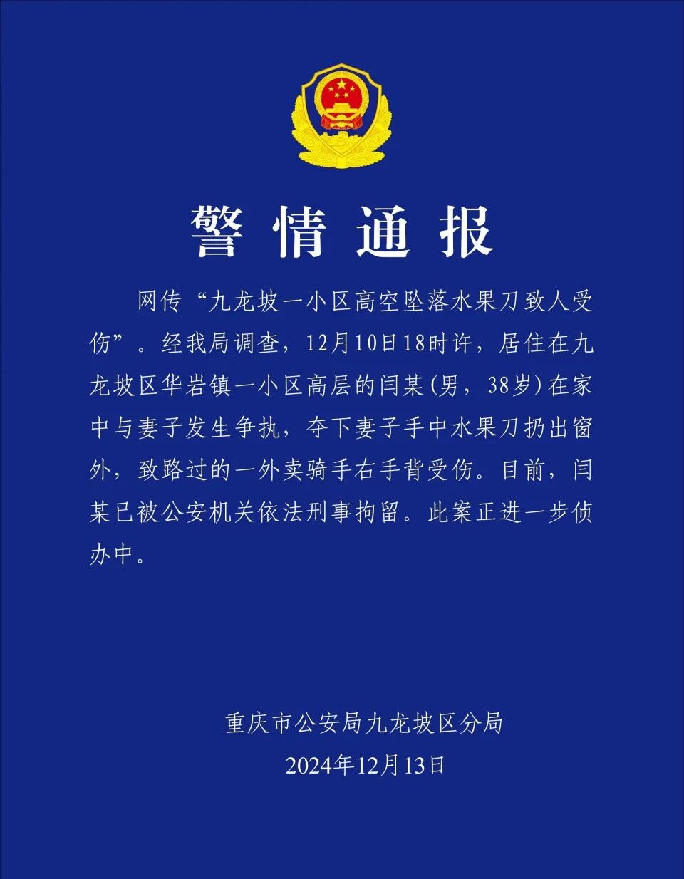 男子因家庭纠纷高空扔刀致人受伤,重庆九龙坡警方通报