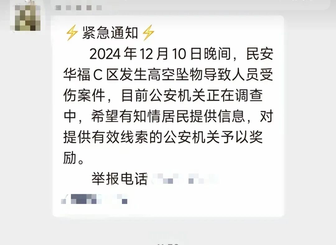 网传紧急通知显示,“2024年12月10日晚间,民安华福C区发生高空坠物导致人员受伤案件,目前公安机关正在调查中,希望有知情居民提供信息,对提供有效线索的,公安机关予以奖励。”