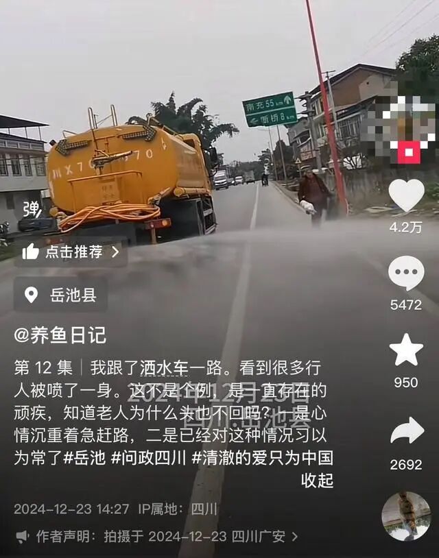 12月23日,有网友发布视频反映,四川广安岳池县广高路上,一辆当地洒水车作业时,对行人视若无睹,车身后方的扇形水雾直接喷洒到多名路人身上,引发关注。
