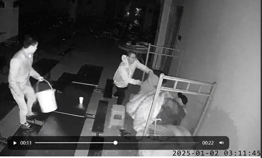 网传视频显示,1月2日凌晨3点11分左右,两名男子各自拎着一个水桶,慢慢靠近墙边的床铺位置,其中一男子踩上一旁的桌凳。随后,两人先后将桶里的水泼向睡在铺位上的老人。老人的上半身、被子等被淋湿。