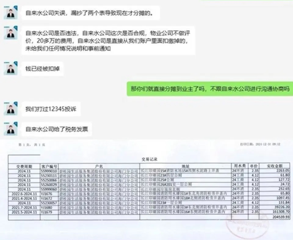 另据其提供的与物业公司微信沟通记录显示,物业解释称:“自来水公司失误,漏抄了两个表,导致现在才分摊的。20多万的费用,自来水公司是直接从我们账户里面扣缴掉的,未给我们任何情况说明和事前通知,而且钱已经被扣掉。” 该业主质问物业:“那你们就直接分摊到业主了吗?不跟自来水公司进行沟通协商吗?”物业则提供了交易记录回应称:“我们打过12345投诉,自来水公司给了税务发票。” 1月7日,南通市海门自来水有限公司工作人员就此事表示:“这个问题,物业和业主今天上午来我们公司跟我们领导对接过的,至于是谁抄漏的,这个是我们公司跟物业的事情,具体的我不清楚,我回答不了。现在还在接洽中,估计物业会发通知。” 此外,对于为什么业主需要平摊的问题,工作人员回应称:“不是我们要分摊,肯定是物业这么决策要分摊到业主头上。要不你打我们营业厅问一下吧,因为系统上都有数据可查。” 工作人员还表示:“反正来的人蛮多的,前面我也接到用户的(投诉)电话了,这个事情我还是要汇报一下。不知道后续是怎么样的,应该会有后续(处理)的,到时候物业会通知业主。” 1月8日,据华商报大风新闻报道,记者联系南通市12345,工作人员表示不清楚其他业主有无来电反映,“别的我不好回答,需要反馈,就反映自己的问题,我可以帮忙登记,帮忙反馈,让小区业主平摊费用不认可吗?此事需要联系自来水公司处理。” 随后记者联系南通市海门区海门街道办,工作人员表示会关注:“我们这边没有收到这个情况,也没接到12345这个单子。我让我们这边社区管理办问一下他们小区物业,具体让社区跟他们沟通。” ![]() ![]() 声明:部分文章来源于网络,转载发布,版权归原作者所有,仅作为参考,如果网站中图片和文字侵犯了您的版权,请联系我们处理!发布是出于传递更多信息之目的并不意味着赞同其观点或证实内容的真实性。https://www.westtimes.cn/h-nd-3883.html