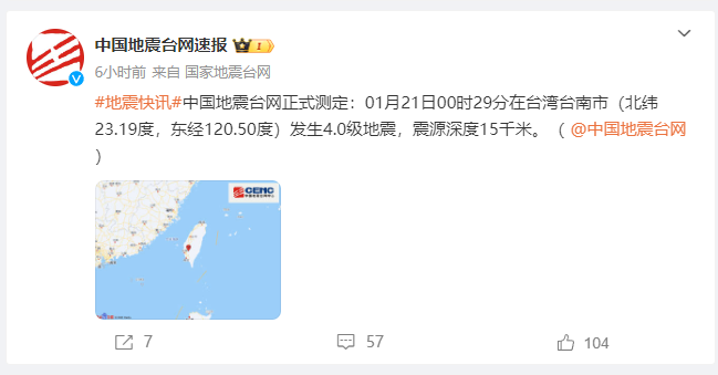 01月21日00时29分在台湾台南市(北纬23.19度,东经120.50度)发生4.0级地震,震源深度15千米。