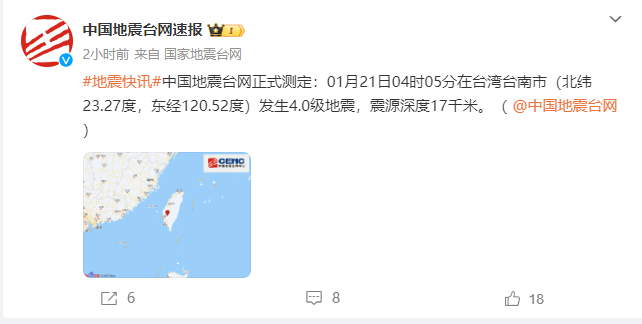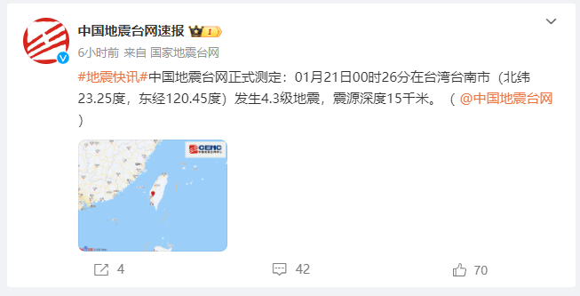 此外,据中国地震台网正式测定: 01月21日00时26分在台湾台南市(北纬23.25度,东经120.45度)发生4.3级地震,震源深度15千米。