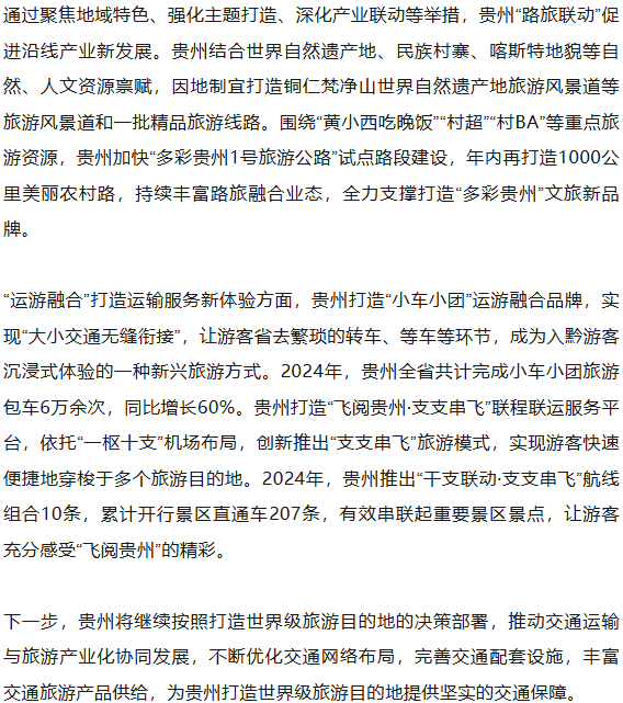 会议介绍,当前,贵州正加快推进交通运输与旅游融合发展,服务支撑贵州省打造世界级旅游目的地,更好地展现中国式现代化贵州新风采。贵州交通运输事业实现翻天覆地大变化,综合交通服务支撑更加有力。“十四五”以来,贵州坚持“交通为旅游赋能、旅游为交通增值”的发展理念,加快构建“快进”旅游综合交通基础设施体系。 ![]() 数据显示,截至目前,贵州公路总里程突破22万公里;铁路里程4256公里,其中高速铁路1808公里,即将实现“市市通高铁”;航道里程3954公里,“北入长江、南下珠江”大通道加快打通;民用航空机场形成“一枢十支”格局,实现9个市(州)全覆盖,是全国两个“市市有机场”的省份之一。累计建成3万多座桥梁,已建和在建的桥梁连起来超过5400公里。世界第一高桥——六安高速公路在建花江峡谷大桥、世界第二高桥——杭瑞高速公路北盘江大桥、世界第三高桥——在建安盘高速公路天门特大桥,均坐落在贵州。 桥旅、路旅、航旅同向发力,交旅融合发展成效显著。近年来,贵州强力推进交通运输与旅游融合发展,全省3A级及以上景区通三级及以上公路占比达72%,4A级及以上景区通三级及以上公路占比达81%,5A级景区实现高速公路全覆盖。贵州着力优化重点景区和旅游度假区的交通组织,通过在桥旅、路旅、新型服务区等方面开展交旅融合示范创建,在技术创新、建造工艺、经济效益、社会影响等方面取得了一系列成效,交旅融合品牌影响力得到显著提升。 通过注重技术创新、景观设计、业态打造等举措,贵州“桥旅融合”引领山地旅游新范式。贵州桥旅融合项目在景观设计上,充分考虑地域特征,以地方(民族)文化为内核,以桥梁景观为延伸,以环境景观为烘托,注重与环境和谐共生。围绕世界级桥梁打造世界级旅游标识,贵州打造了坝陵河大桥、平塘大桥和花江峡谷大桥等桥旅融合项目,丰富拓展极限运动、科普研学、观光旅游、休闲度假等旅游业态。 ![]() ![]() END 来源:人民网、中国新闻网 编辑:王宇豪 审核:嘻嘻 ![]() 声明:部分文章来源于网络,转载发布,版权归原作者所有,仅作为参考,如果网站中图片和文字侵犯了您的版权,请联系我们处理!发布是出于传递更多信息之目的并不意味着赞同其观点或证实内容的真实性。https://www.westtimes.cn/h-nd-6240.html