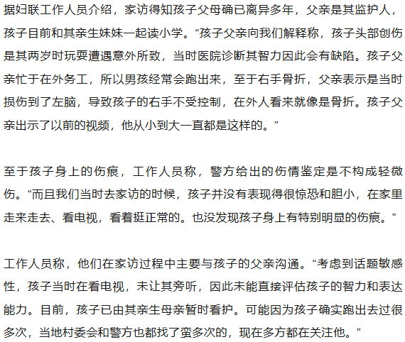 13岁男孩遭父亲家暴离家流浪?当地回应:孩子智力有缺陷,未发现虐待行为发表时间:2025-07-15 16:00 ![]() 近日,有江西南昌网友在社交平台发文称,自己在当地某公园遇见一名男孩,身上有多处伤痕,其自述父亲酗酒并有家暴行为,爷爷奶奶也曾参与,手部骨折是父亲造成,因此不敢回家,引发广泛关注。7月14日,当地有关部门工作人员表示,目前孩子已由其生母暂时看护。 据该网友发文介绍,不久前的某天凌晨2点多,她在南昌市新建区某公园碰到一名13岁的小男孩,他的身上全是伤和蚊虫叮咬的痕迹,右手严重骨折,头部多处创伤和肿包。“我出于疑惑,去向小男孩询问情况,我在沟通中发现小男孩智力正常,表达能力清晰。小男孩跟我说,头上的伤是电风扇扇叶割伤及皮带抽打导致,手部骨折是父亲人为导致。” 该网友称,据她了解,小男孩的父亲酗酒家暴,母亲因家庭原因已与孩子父亲离婚多年,孩子的爷爷奶奶均会参与家暴,导致这个小男孩在外面流浪了两天不敢回家,发现他之后已报警送至辖区派出所休息。“民警过来后,我们沟通了解到,小男孩目前不敢回家,因为之前也发生过类似情况,被好心人报警送回家后受到家暴。可能因为是凌晨,也联系不上小男孩的母亲。” ![]() 14日下午,南昌市公安局新建分局长堎派出所工作人员表示知晓该事件,已将孩子父母叫到派出所了解过情况,“这名孩子因为小时候头部被风扇削到,导致其生活不能自理,精神状态有点问题,在语言上表达不清楚。我们经过调查发现没有虐待儿童的行为发生。其他具体情况不清楚,建议向妇联了解。” 随后,新建区妇联工作人员表示,事发当天警方接到孩子父亲的报案,并于当天找到了孩子。隔了一天之后,妇联针对此事来到了当地村委会以及男孩家中进行家访。 ![]() END 来源:扬子晚报 编辑:王宇豪 审核:嘻嘻 ![]() 声明:部分文章来源于网络,转载发布,版权归原作者所有,仅作为参考,如果网站中图片和文字侵犯了您的版权,请联系我们处理!发布是出于传递更多信息之目的并不意味着赞同其观点或证实内容的真实性。https://www.westtimes.cn/h-nd-6246.html