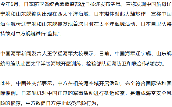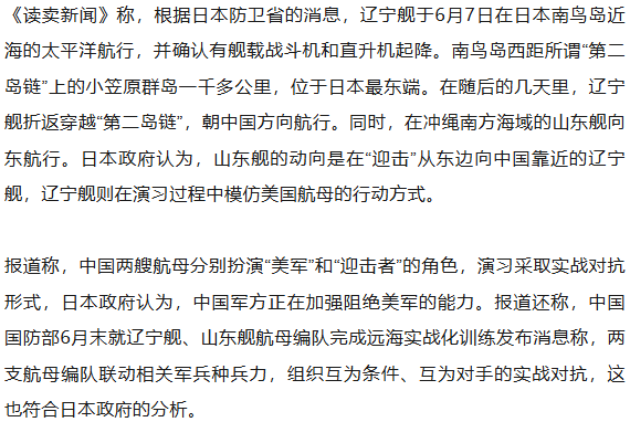 据日本《读卖新闻》18日报道,中国海军辽宁舰、山东舰航母编队6月赴西太平洋等海域开展训练,多名日本政府消息人士透露,日本政府分析认为,中国双航母编队进行的是迎击美国航母的实战对抗演习,扮演美国航母角色的辽宁舰在演习中模仿美航母行动方式,山东舰进行“迎击”。