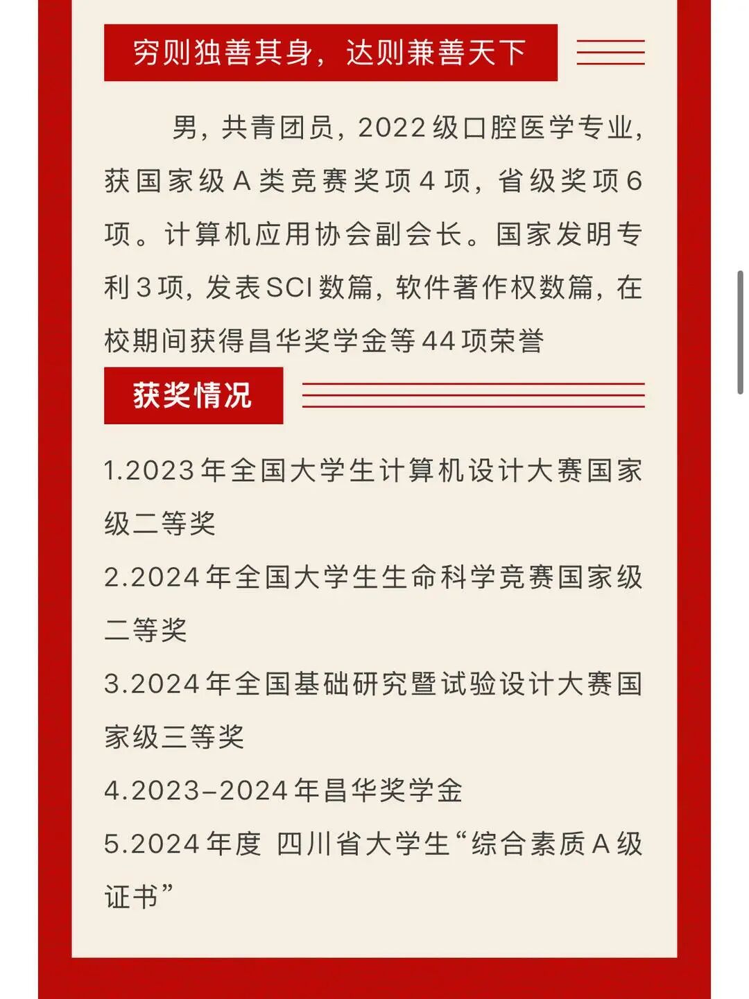 四川川北医学院“本科生逆天学术履历”引发争议,校方通报发表时间:2025-07-17 17:28 ![]() 7月17日,川北医学院专项工作组通报:近日,学校学生罗某某的科研情况受到部分网友关注。学校高度重视,立即成立专项工作组开展调查核实。现将相关情况通报如下。 经Web of Science检索查询,罗某某已发表的7篇论文,包括以第一作者在Frontiers in Nutrition发表article(研究论文)1篇、在Frontiers in Public Health发表meta analysis(荟萃分析)1篇、在Nature Machine Intelligence发表correspondence(评论文章)1篇,由其带领学生团队在教师指导下完成;以通讯作者在JAMA internal medicine、Annals of Oncology、Journal of Thoracic Oncology发表letter(学术评论)4篇,由其组织学生团队完成。 经核查,罗某某曾收到npj Digital Medicine、Journal of Translational Medicine等期刊审稿邀请,目前已参与3篇论文审稿。 网友质疑的PPT图片为学校2024年“昌华奖学金”评选现场展示材料,罗某某在材料中存在成果表述不严谨问题,有自夸炫耀之嫌。学校已对其进行严肃批评教育。 学校始终坚持立德树人根本任务,注重培养学生创新能力,鼓励学生积极参与科学研究,并将进一步加强指导、监督和管理,营造风清气正的科研环境。 衷心感谢社会各界对学校的关心、支持与监督。