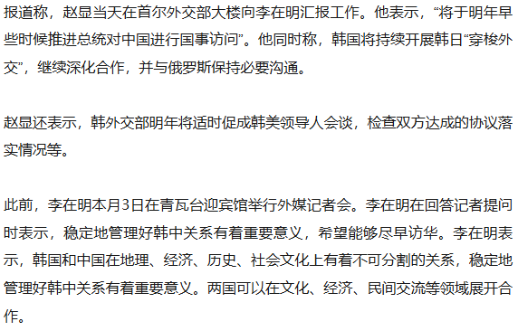 据韩联社报道,韩国外交部长官赵显19日表示,外交部将推进总统李在明明年访华事宜。