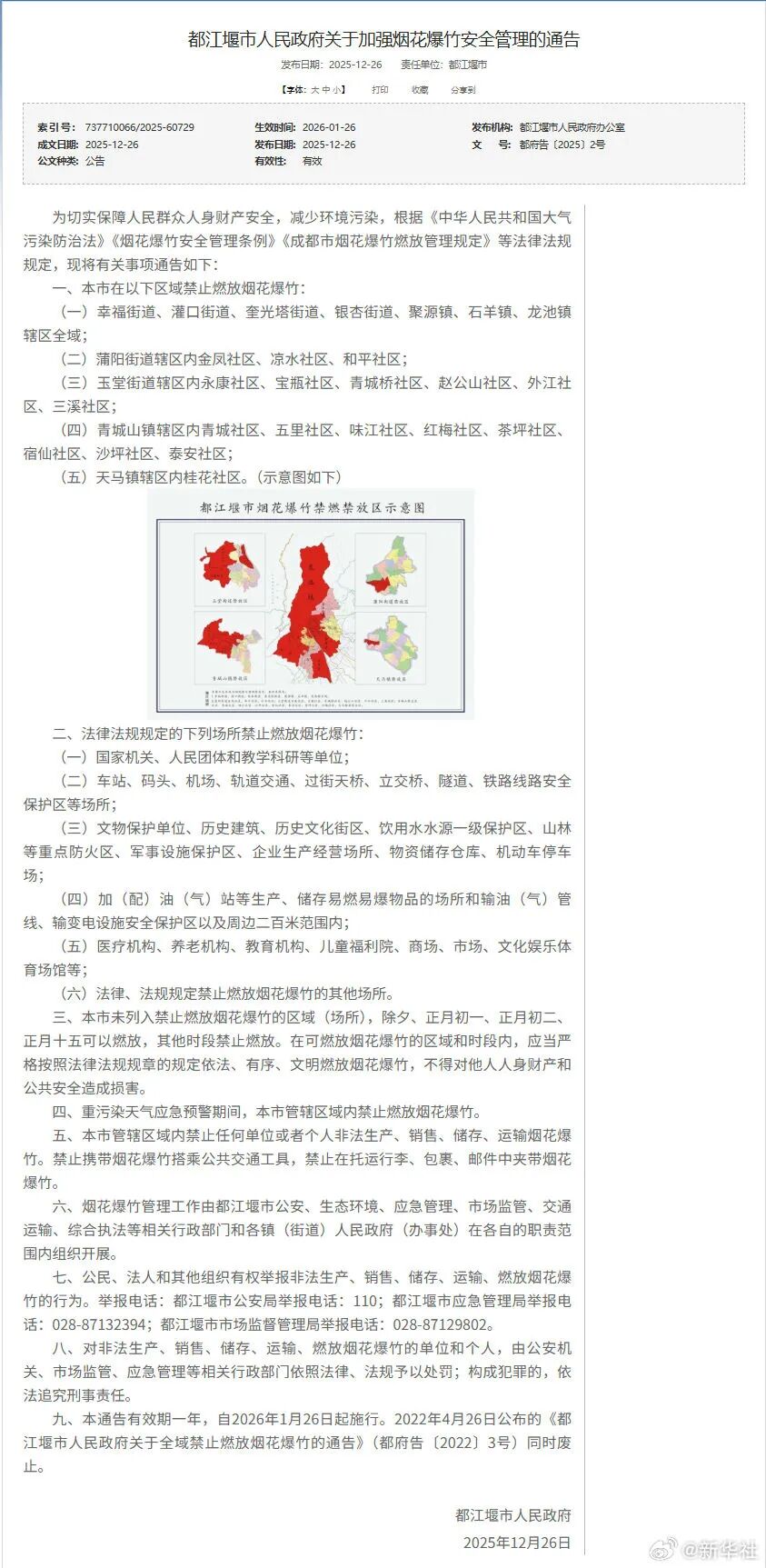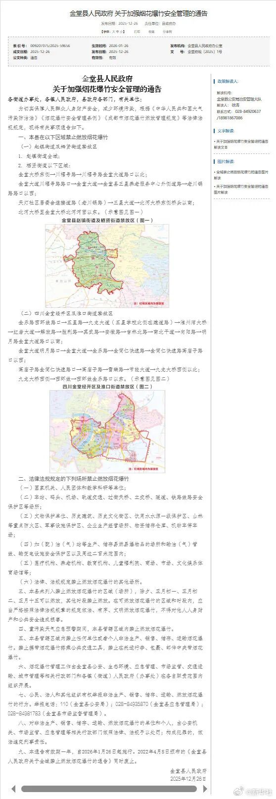 12月26日,成都8县市陆续发布烟花爆竹安全管理《通告》,对本区域的烟花爆竹燃放管理进行优化调整。《通告》显示,在成都8县市划定的限制燃放区域内,市民群众可在除夕、正月初一、正月初二、正月十五这四天燃放烟花爆竹。