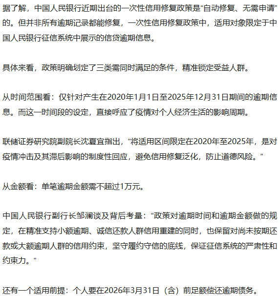 重磅政策落地,超千万人信用将被“修复”发表时间:2026-01-06 12:41 ![]() 2026年伊始,不少人发现个人征信报告里的贷款逾期记录减少,有的甚至被清零。无论是信用卡、房贷还是消费贷,只要符合条件,均适用“免申即享”的一次性信用修复政策。 据业内测算,该政策覆盖千万级别的受益人群,主要包括小额逾期、事后已结清的工薪族、个体工商户等。 “免申即享”广泛受益随着征信修复的实施,越来越多的用户在网络分享自己“干净”的征信报告。“我太需要这个政策了,信用修复对忘记还款、逾期金额不大的我很友好。”四川有用户在社交媒体用“人生重启”来描述征信修复,此前她因信用卡有800元逾期,而导致房贷被拒。 还有用户询问是否需要自己操作,该怎么查询? 一位银行从业者表示,银行内部已经建立了工作小组,多部门相互配合落实相关工作。中国建设银行明确,客户可登录App或个人网上银行,搜索“信用报告”进行查询;中国农业银行提出,如客户对个人信用报告上的逾期信息有疑问,可联系该行营业网点或业务办理行进行咨询和确认。 给非恶意逾期“再来的机会”![]() 解决困境不等于债务豁免![]() 来源:国是直通车 编辑:王宇豪 | 审核:嘻嘻 END ![]() 声明:部分文章来源于网络,转载发布,版权归原作者所有,仅作为参考,如果网站中图片和文字侵犯了您的版权,请联系我们处理!发布是出于传递更多信息之目的并不意味着赞同其观点或证实内容的真实性。https://www.westtimes.cn/h-nd-8541.html