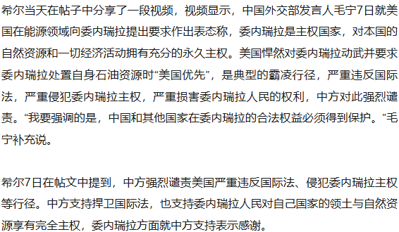 当地时间7日,委内瑞拉外长希尔在社交平台上发帖称,就中方对委支持表示感谢。