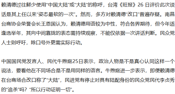 据台湾《联合报》25日报道,赖清德去年首次以台湾地区领导人身份出席台商春节活动时,曾提及所谓两岸“互不隶属”的谬论,而今年致辞多次使用“中国大陆”“两岸”表述,并提及“善意”“理解”等词,语调明显放软。赖清德声称,从蔡英文到其任内都希望两岸“维持现状”。