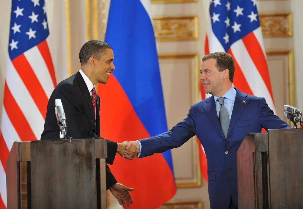 这张拍摄于2010年4月8日的资料照片显示,时任美国总统奥巴马(左)和时任俄罗斯总统梅德韦杰夫在捷克首都布拉格签署新核裁军条约后出席新闻发布会时握手。
