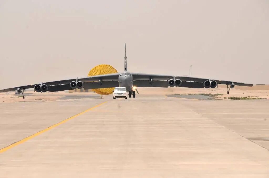 这张资料照片显示的是2016年4月9日,一架美国空军的B-52轰炸机抵达卡塔尔乌代德空军基地。