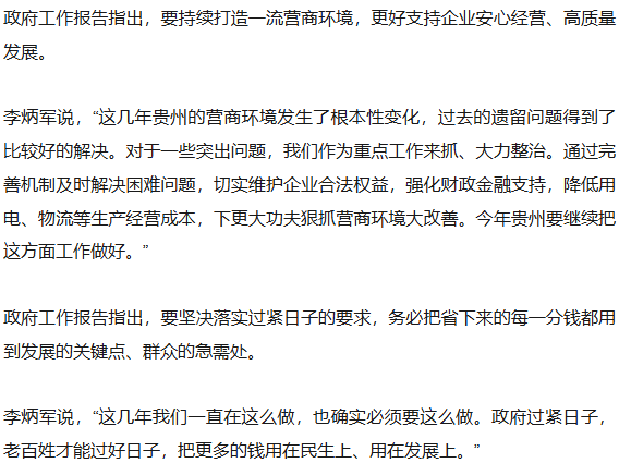 李炳军表示,政府工作报告对“十五五”和今年的目标任务,部署的也很明确。“接下来要把政府工作报告、十五五规划纲要草案讨论好,特别是要把我们贵州的重大项目、民生项目能够纳入国家的规划,回去后我们要根据要求把目标任务一条一条落实好。