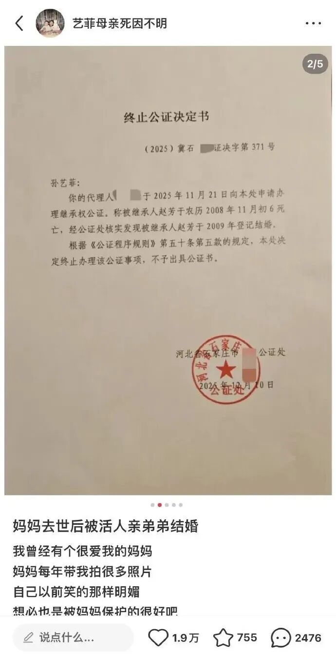此前报道: 近日,有网友在社交平台上发帖称其母亲去世后“被结婚”,身份长期被冒用,自己18岁合法继承母亲遗产时发现只剩空壳。 据该网友介绍,在其9岁时母亲生病去世,留下大量珠宝、商铺等遗产,但其成年有继承权利后,在办理遗产继承时发现母亲名下遗产只剩一间小商铺,且律师经过调查发现其并不是唯一子女,无法办理财产继承。 该网友称,经调查,在其母亲死亡的次年,其舅舅觊觎其母亲的财产,遂和妻子商量冒用其母亲的身份,即其舅妈以其母亲的信息成功办理身份证,并用该身份证和舅舅登记结婚,导致其死去的母亲在法律上有了配偶及后续子女,大量遗产被侵吞。 ![]() 当事人最新发声:身份被舅妈冒用后与舅舅登记结婚 声称为解决我上学问题 但我实际是被小姨收养 事件当事人孙女士称,事情缘由最早可追溯至2008年12月初,母亲突发疾病离世。相关住院病案显示,孙女士母亲赵芳被诊断患有败血症、中毒性肝炎、中毒性脑病。 当时年仅9岁的孙女士在父母离婚后,一直跟随母亲生活,母亲病倒住院后,孙女士被小姨从医院带走,仅从亲戚处听到了母亲的死讯,也未参加母亲葬礼。之后孙女士一直随小姨一家生活,其提供的协议书显示孙女士父亲与其小姨签订了相关收养协议。 直到2018年,19岁的孙女士提出继承母亲遗产,在进行相关公证手续时,孙女士被告知母亲有其他婚姻记录,无法证明孙女士为独女,故无法办理,这令孙女士感到疑惑。直到几个月前,孙女士从母亲户籍档案所在地查询到相关结婚登记记录,发现照片上的人是大舅妈,结婚登记时间为2009年12月,即其母亲离世后一年。同时母亲的身份证照片也被替换成了大舅妈。 孙女士就此情况向其亲属询问,被告知当时这一做法是为了解决孙女士的上学手续。但孙女士称自己一直随小姨一家生活,相关说法无法令其信服。孙女士舅舅赵先生,表示目前正在赶往见孙女士的路上,相关情况暂不便透露。 ![]() ![]() 来源:荔枝新闻、鲁山融媒、荆楚网 END ![]() 声明:部分文章来源于网络,转载发布,版权归原作者所有,仅作为参考,如果网站中图片和文字侵犯了您的版权,请联系我们处理!发布是出于传递更多信息之目的并不意味着赞同其观点或证实内容的真实性。https://www.westtimes.cn/h-nd-9301.html